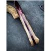 Dall sheep 6” Drop Point Camp Knife – Exhibition Grade. Exhibition grade custom blade. 6” harpoon drop point blade in Mirror polished Nitro-V. Mexican Rosewood bolster with a framed Dall sheep and Mexican Rosewood handle. Stainless steel hardware. Scout carry leather sheathe. Engraved and stamped with the WSSBC logo.